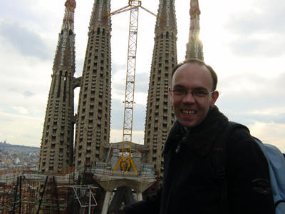 Op het beroemde bruggetje tussen de twee torens. En nu weer naar beneden, alstublieft.