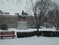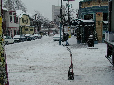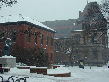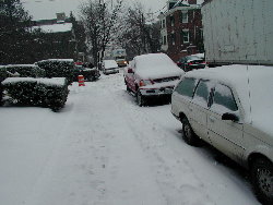 Hoewel ze het gisteren bij het weerbericht nog niet zeker wisten is de winter dan toch helemaal terug in Providence. Het valt hier op dit moment zo hard uit de lucht dat je, als je buiten bent zonder muts, binnen honderd meter een hoed van sneeuw op hebt. Voor de deur glijden auto's heen en weer op de gladde weg en ramde een vrachtwagen op een haartje na een geparkeerde pickup truck. In ieder geval zijn ze het wel gewend, hier: er verschijnen plotseling allerlei sneeuwploegen, sneeuwverwaaiers, sneeuwschoppen en mensen in sneeuwschoenen op straat. Toen ik zelf even een krant ging halen werd ik bijkans geraakt door een kleine lawine die van het dak donderde.